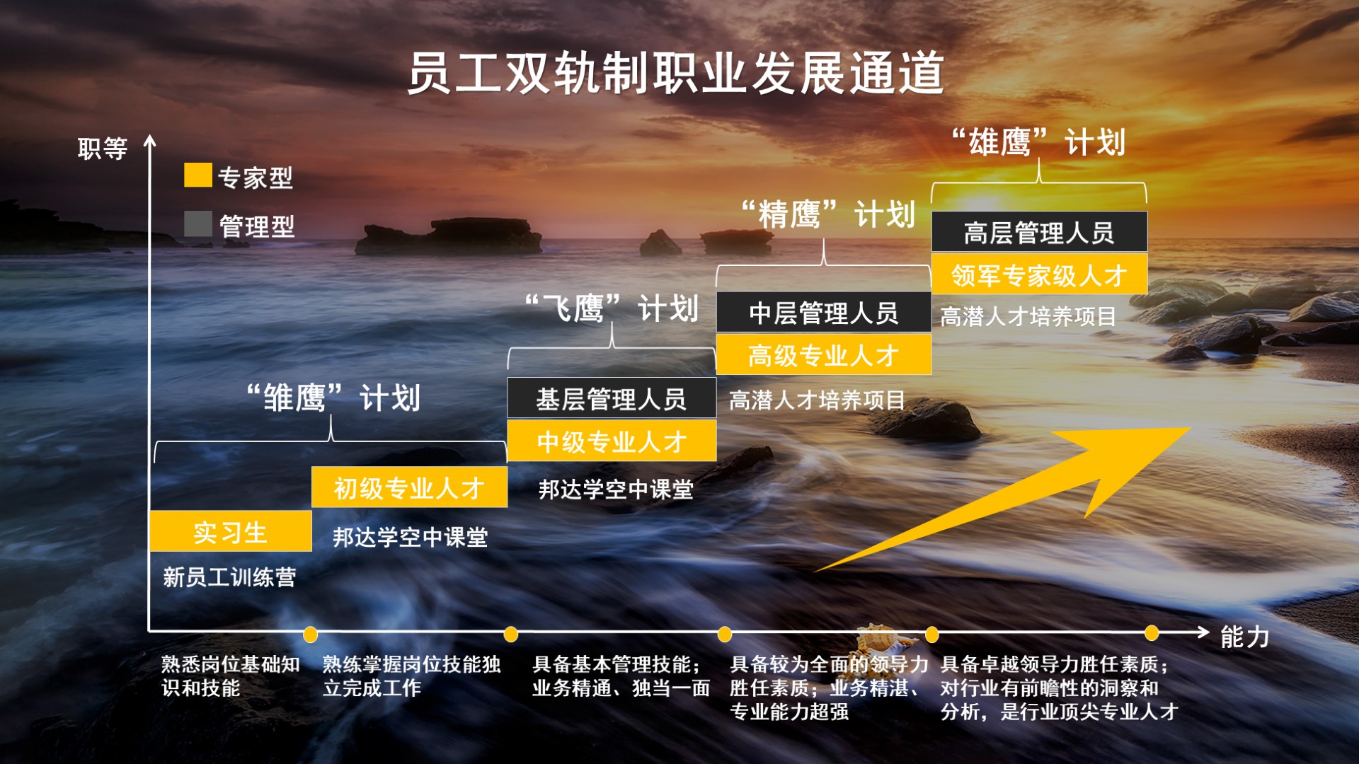 我們建立清晰的職級體系,推行雙軌制職業(yè)發(fā)展通道,為員工提供多層級職業(yè)發(fā)展路徑。