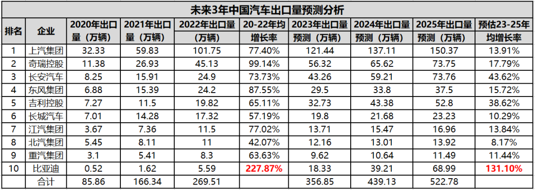中國國產(chǎn)汽車充分發(fā)揮體系化、規(guī)?;膬?yōu)勢,不斷豐富海外產(chǎn)品矩陣,產(chǎn)品力和品牌力持續(xù)上升。依照日系車企歷史趨勢,結(jié)合中國歷史增速變動,預估2025 年國產(chǎn)車海外銷售占比有望提升至 20%,2023-2025年分別為 379/461/550 萬輛,以下是國內(nèi)主要汽車企業(yè)未來三年出口量預估數(shù)據(jù)。